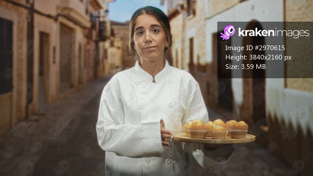 Woman chef in white coat holds a wooden tray of golden muffins and shrugs one hand, palms up, on a narrow street; resignation.
