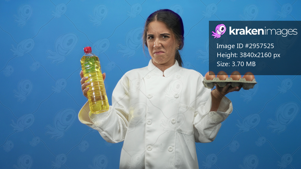 Woman chef in white coat holds bottle of oil and carton of eggs, grimacing while comparing ingredients in a studio; disgust dilemma.