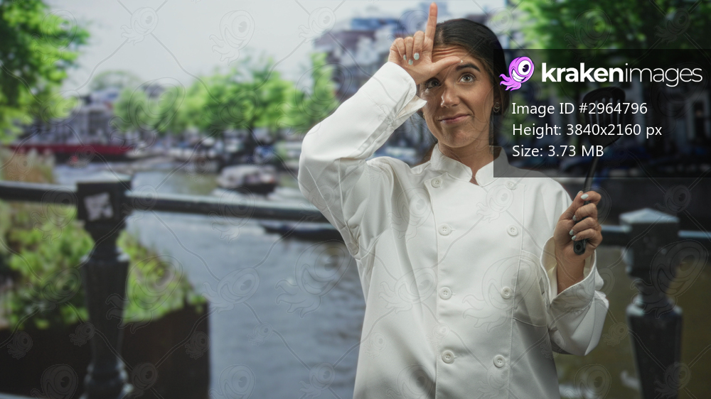 Woman chef in white coat makes l sign on forehead while holding a black spatula on a canal street bridge setting, looking wryly at camera; playful mischief. - Kraken Images