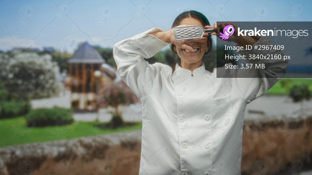 Woman chef in white coat smiling holds a metal grater over her eye with one hand and waves the other hand in a studio set; playful curiosity.