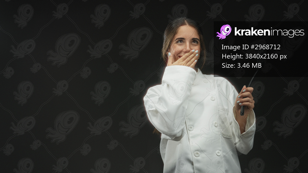 Woman chef in white jacket covers mouth with hand while holding a spatula on a dark studio set; playful joy.