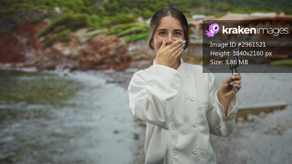 Woman chef in white jacket holds a grater, hand covers mouth laughing on a rocky beach by seaside houses; joy.
