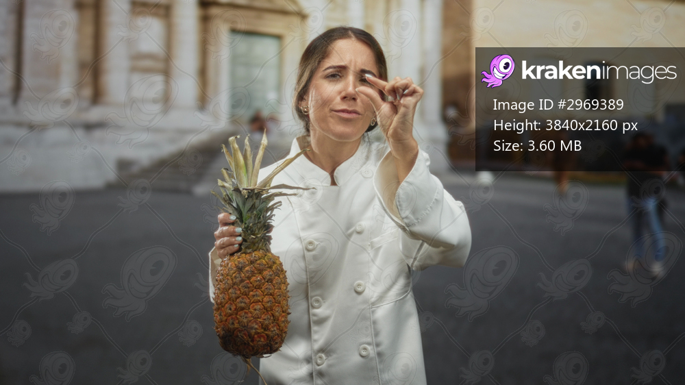 Woman chef in white jacket holds a whole pineapple and pinches a small pinch of salt between fingers while smiling in front of an old stone building with steps; playful cooking. - Kraken Images