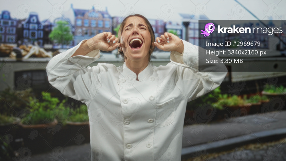 Woman chef in white jacket plugs ears with fingers and yells on a street by canal boats and buildings; frustration stress overwhelmed.