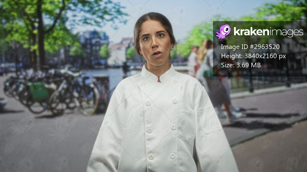 Woman chef pointing finger forward on a busy street by a canal with bicycles and buildings, stern expression; firm authority.
