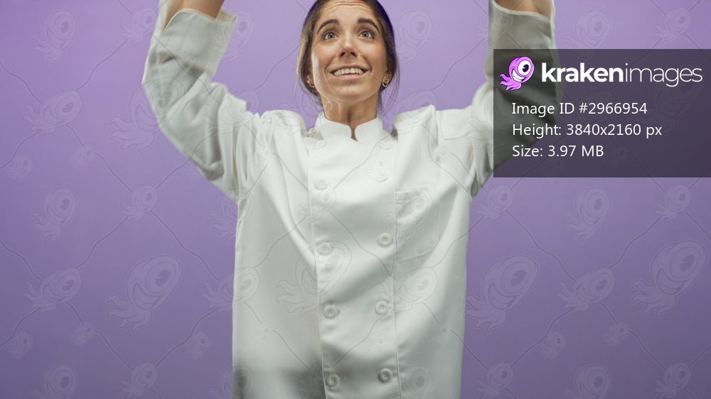 Woman chef raises hands and gestures in studio purple backdrop, wearing white coat; surprise urgency.