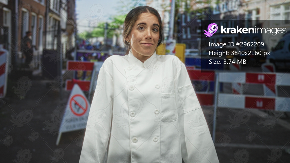 Woman chef smiling, head tilted, wearing white chef jacket in a blocked street construction zone; cheerful optimism.