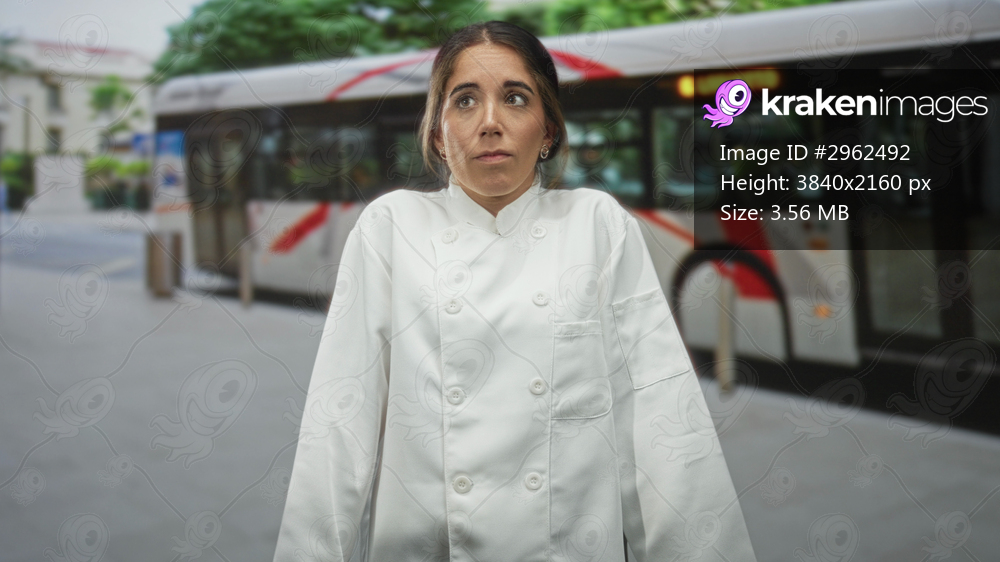 Woman chef stands with visible face and relaxed arms on street near a city bus stop, wearing white chef coat and looking straight at camera; quiet determination. - Kraken Images
