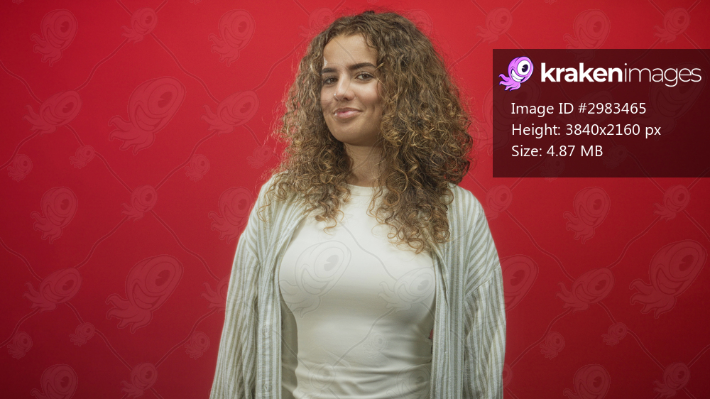 Woman chest visible smiling with head turned right and relaxed shoulders against red studio wall; confidence warmth.