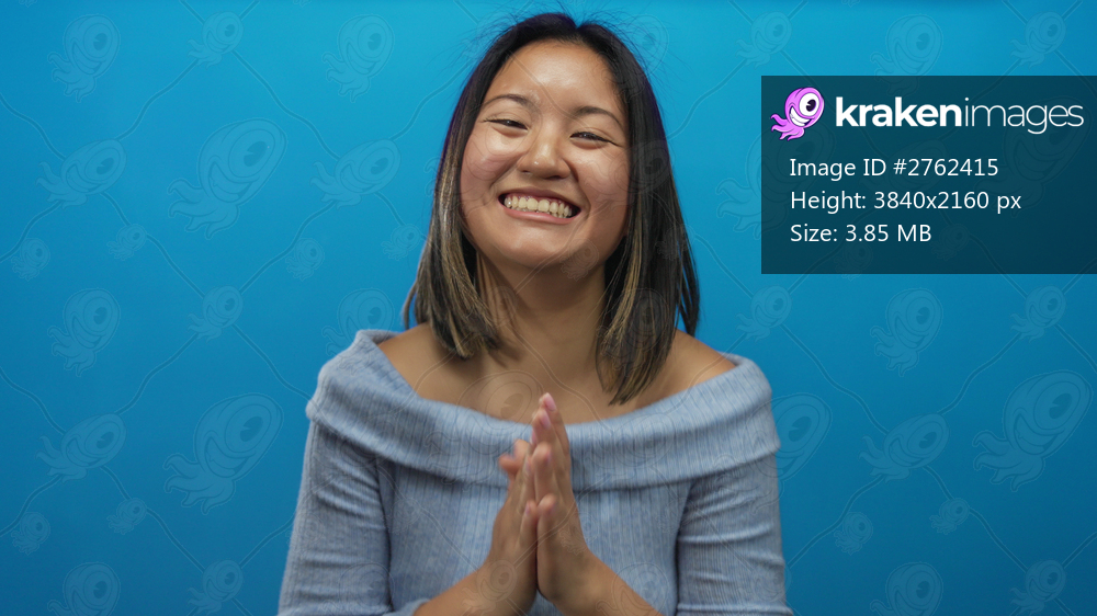 Woman clapping enthusiastically against an isolated blue background wall, showcasing joy and positivity with a vibrant smile, perfect for expressing happiness and success. - Kraken Images