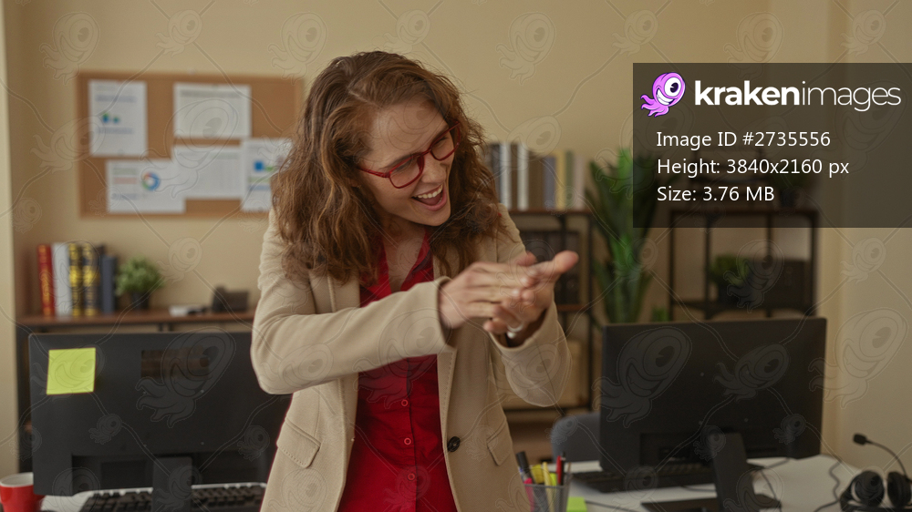 Woman clapping enthusiastically in modern office setting wearing red shirt and glasses surrounded by computers and charts, conveying motivation and success in workplace. - Kraken Images