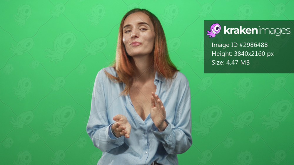 Woman clapping hands against a green screen studio backdrop, smiling with light blue shirt and relaxed posture; playful casual confidence.