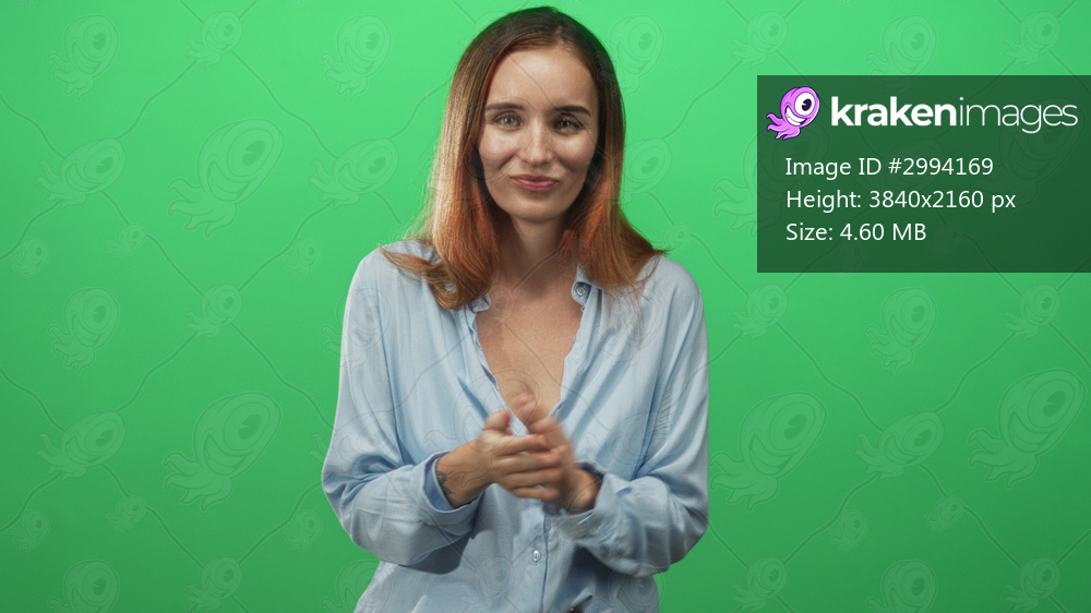 Woman clapping hands against a green screen studio backdrop, smiling with light blue shirt and relaxed posture; playful casual confidence.