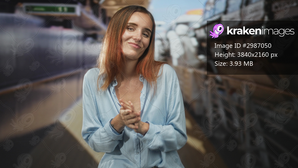 Woman clapping hands at airport baggage claim in light blue shirt, smiling; contentment travel patience.