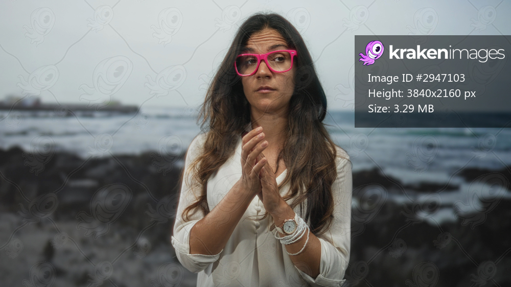 Woman clapping hands at seaside wearing bright pink glasses and white blouse with watch and bracelets; skepticism.