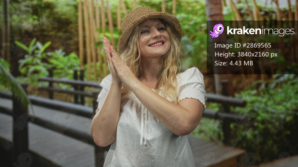 Woman clapping hands by a wooden bridge in a forest setting wearing a straw hat and white blouse; serenity nature escape.