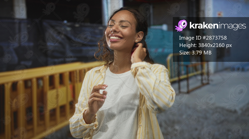 Woman clapping hands by a yellow safety barrier at a building construction site, smiling with eyes closed while wearing a striped shirt and white tee; joy. - Kraken Images