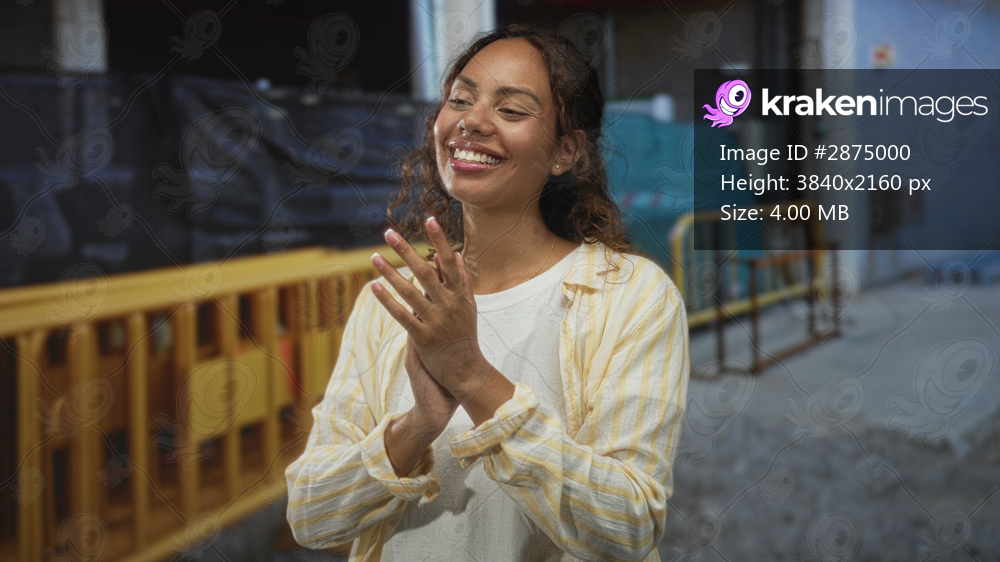 Woman clapping hands by a yellow safety barrier at a building construction site, smiling with eyes closed while wearing a striped shirt and white tee; joy. - Kraken Images
