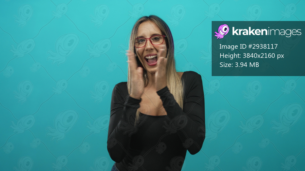 Woman clapping hands and dancing with raised arms in a turquoise studio wearing black top and red glasses; joy.