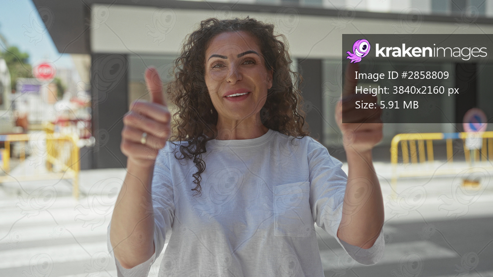 Woman clapping hands and giving thumbs up on city street amid crosswalk lines beside yellow barriers; optimism.