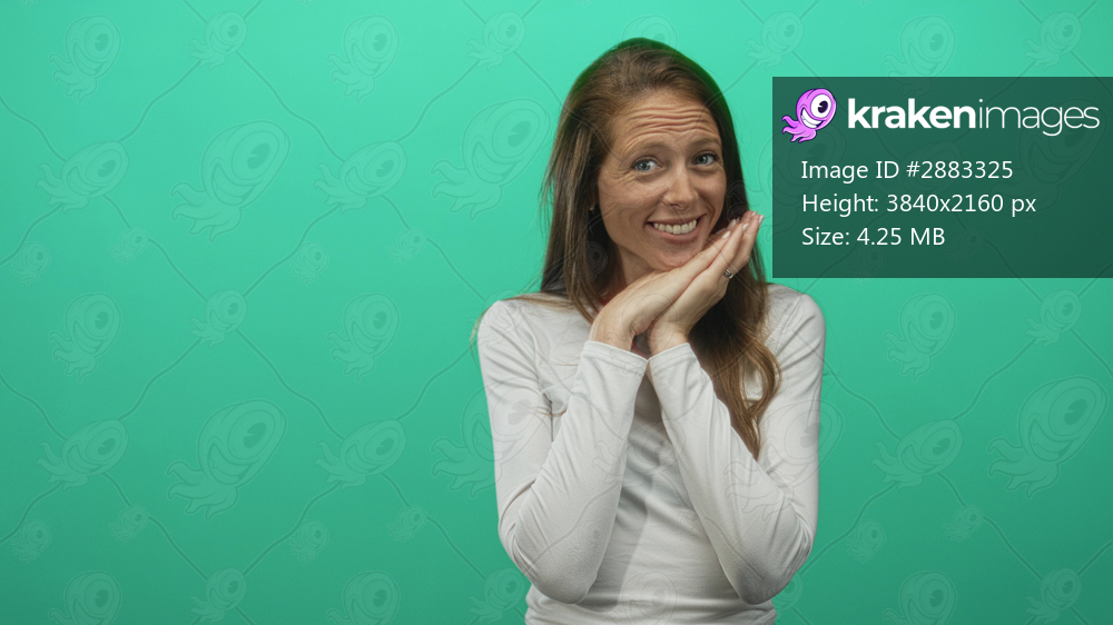 Woman clapping hands and holding palms near face in teal studio wearing a white long sleeve top, facing camera; joy.