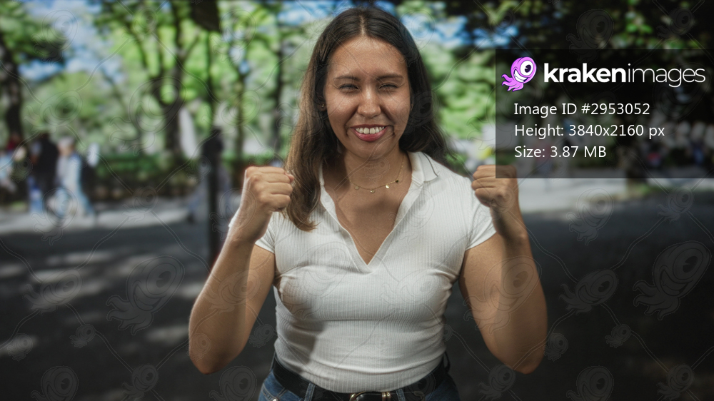 Woman clapping hands in a forest setting, smiling with raised arms and visible hands, wearing white top and jeans; joy celebration optimism.