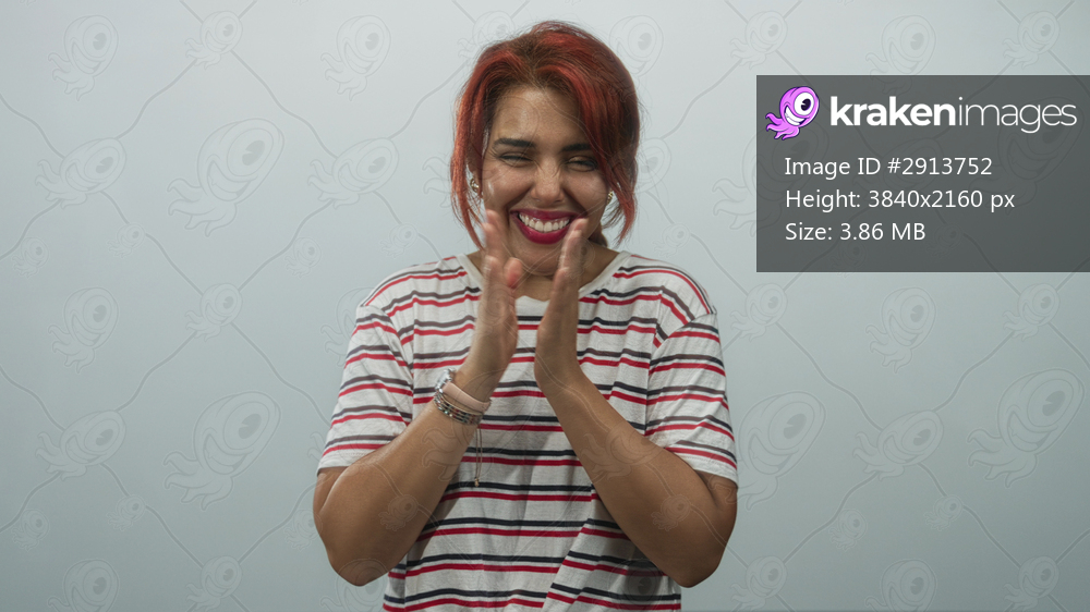 Woman clapping hands in a pale blue studio wearing a striped t shirt, red hair and closed eyes; joyful celebration.