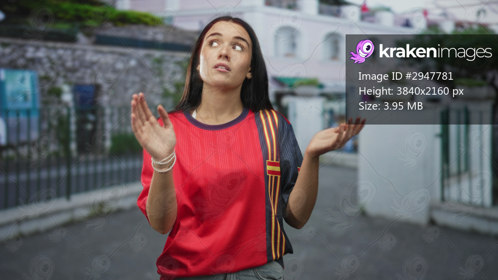 Woman clapping hands in a red soccer jersey on a street building, young hispanic team fan wearing bracelets and looking upward; pride support.