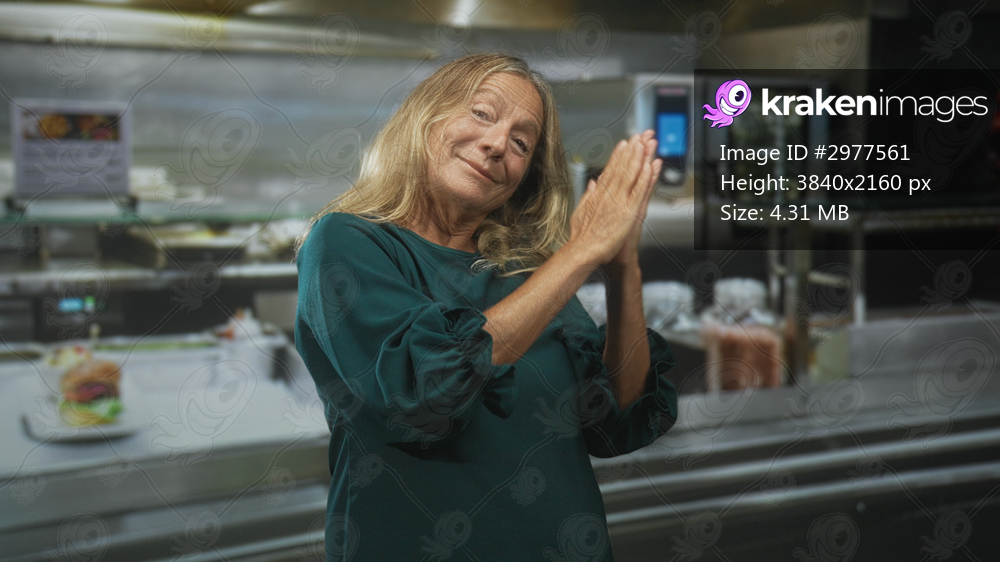 Woman clapping hands in a restaurant kitchen building, blonde senior smiling with palms together and relaxed posture; gratitude.