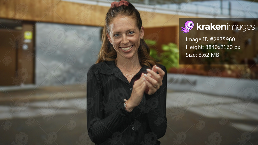 Woman clapping hands in building entrance near potted plants, smiling with eyes closed and leaning forward; joy celebration support.