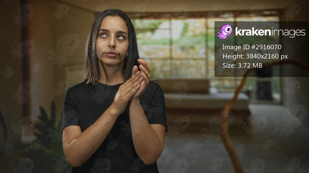 Woman clapping hands in living room by large window and sofa, palms visible and midshot; subtle annoyance.