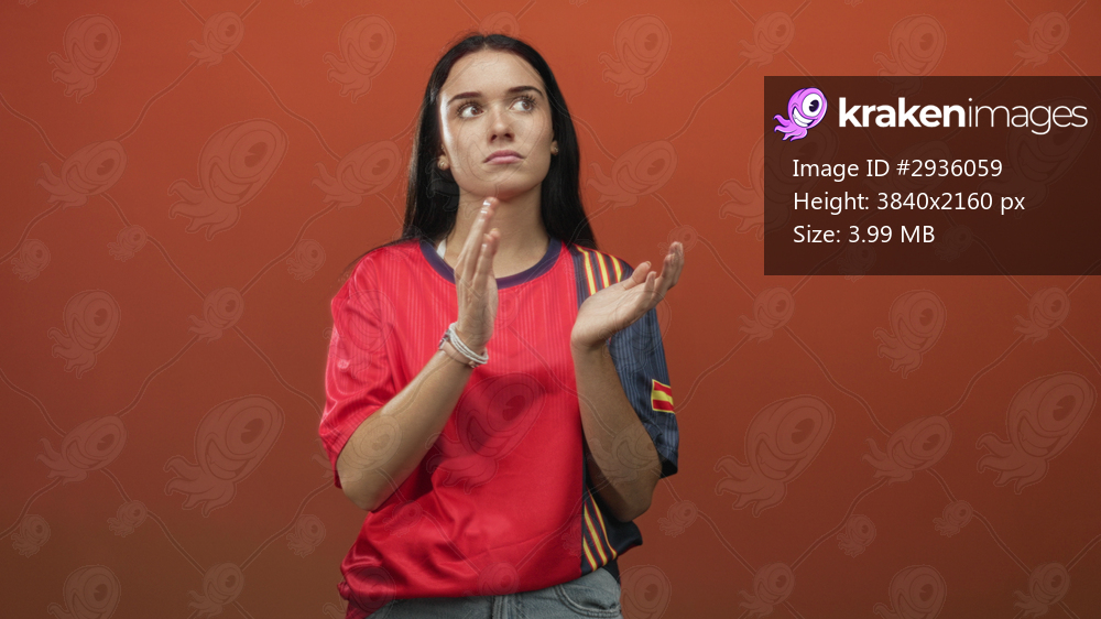 Woman clapping hands in red spain soccer jersey and bracelet, looking upward against an orange studio backdrop; team pride.