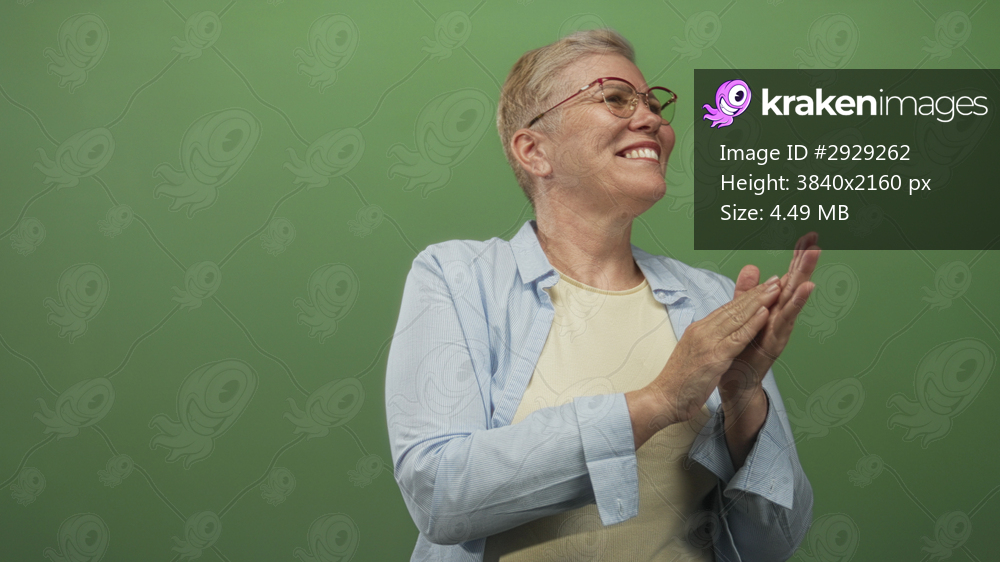 Woman clapping hands in studio against green backdrop, smiling broadly and wearing glasses; celebration joy.