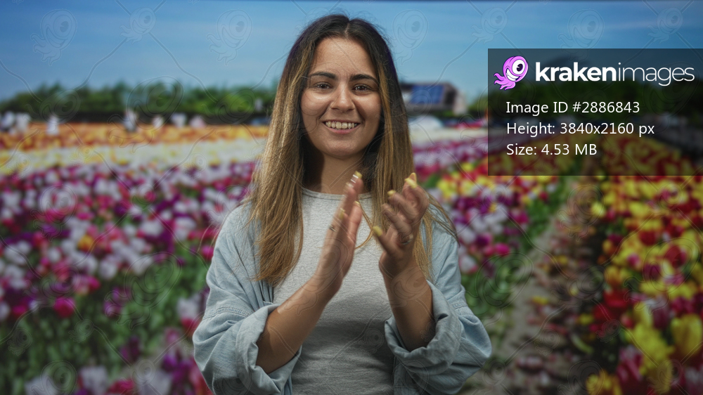 Woman clapping hands in studio with tulip field set behind her, smiling at camera while wearing a light denim shirt; joy celebration.