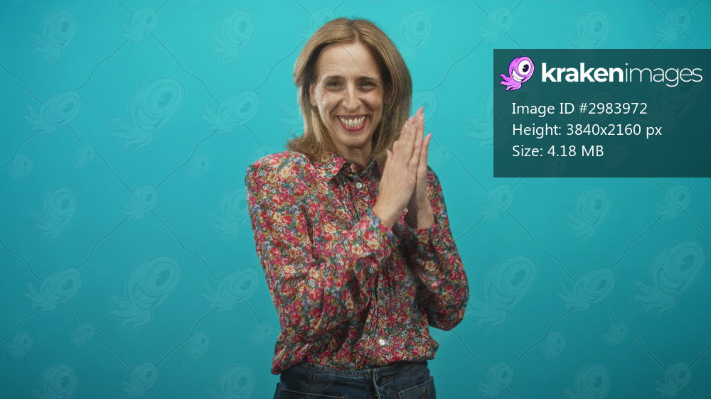 Woman clapping hands in turquoise studio wearing floral blouse and jeans, smiling broadly; joy celebration warmth.