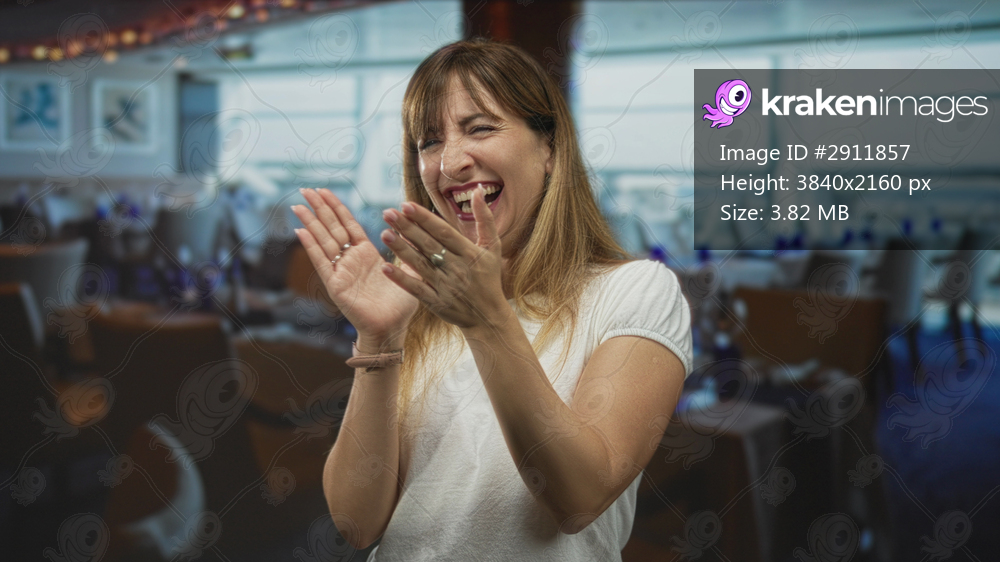 Woman clapping hands and laughing at a table in a bright restaurant dining room with wine bottles and chairs visible; joy celebration.