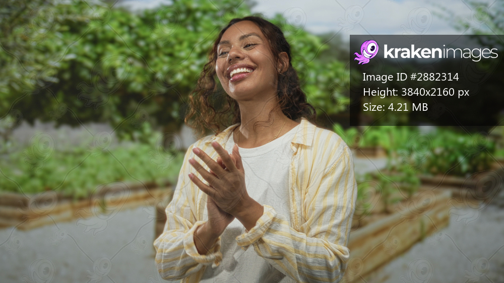 Woman clapping hands and laughing while facing camera in a forest community garden with raised planters; joyful celebration.