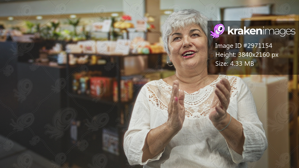 Woman clapping hands near shop shelves of packaged goods in a retail building while smiling and speaking energetically; celebration joy.