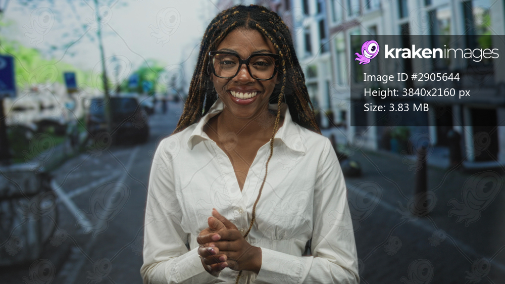 Woman clapping hands on a cobbled city street near bicycles and stone bollards, wearing white blouse and glasses; joy confidence.