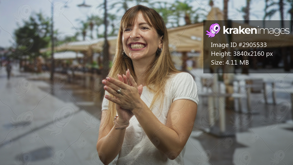 Woman clapping hands on a street terrace outside restaurant, smiling broadly and applauding with visible hands and rings; joy celebration.