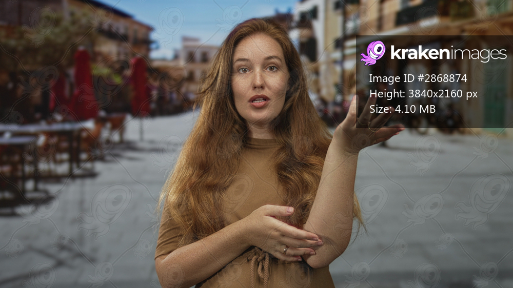 Woman clapping hands on a sunny pedestrian street with red umbrellas at cafe tables; gratitude happiness.