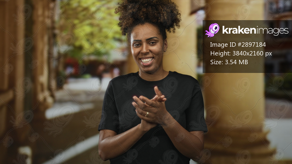 Woman clapping hands on an old town street near stone columns while smiling and looking at camera; joy celebration.