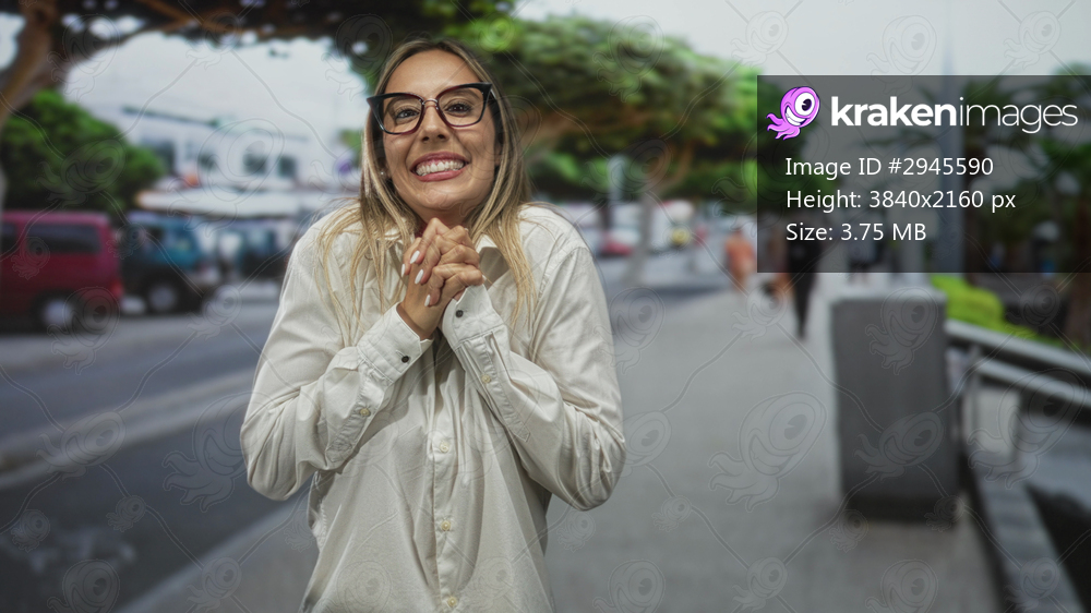Woman clapping hands on city street sidewalk, smiling with glasses and white shirt while parked vans and trees blur behind her; joy.