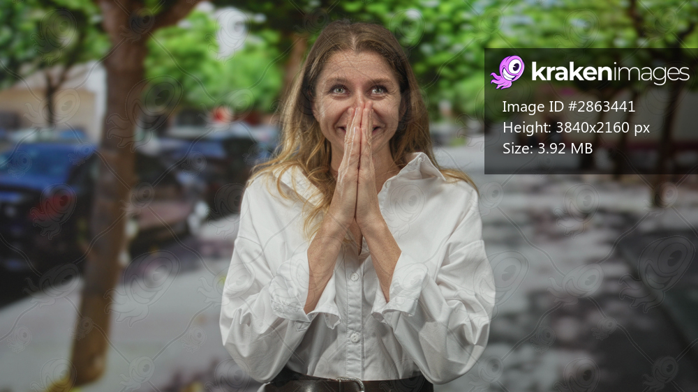 Woman clapping hands on street wearing white shirt and belt, smiling with open palms toward camera; joy gratitude.