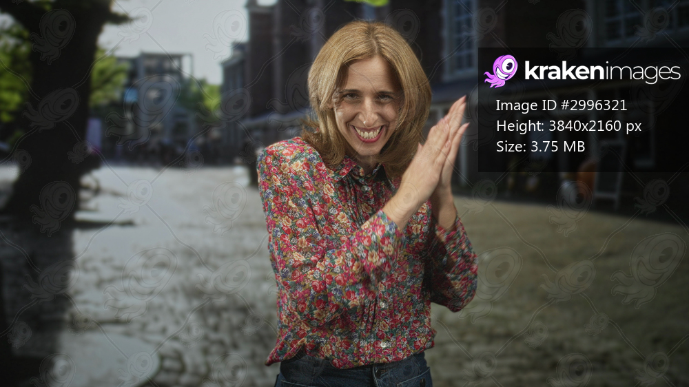 Woman clapping hands on sunlit cobblestone street wearing floral blouse and jeans, smiling with palms together and leaning slightly forward; playful joy. - Kraken Images