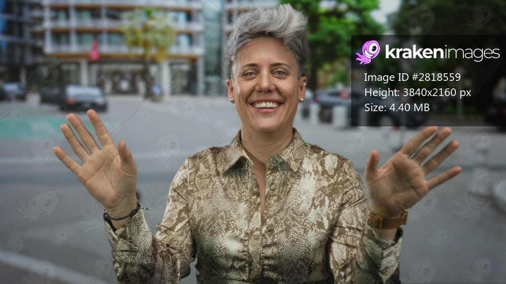 Woman clapping hands on urban city street in daylight near parked cars and buildings with short hair wearing snake print blouse; joy.