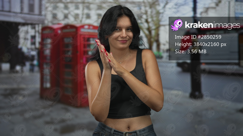 Woman clapping hands on urban street near red phonebooths and white van passing by; joyful celebration.