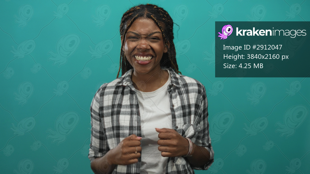 Woman clapping hands with open mouth and braided hair wearing plaid shirt in teal studio backdrop; joy celebration energy.