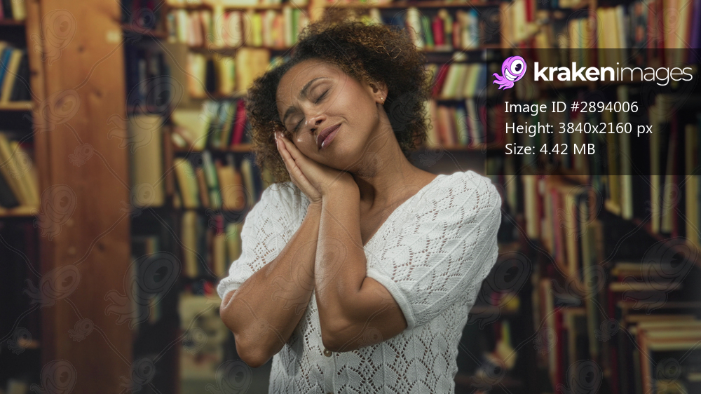 Woman clapping hands and pressing palms together in library building amid tall bookshelves and wooden stacks; calm reflection.