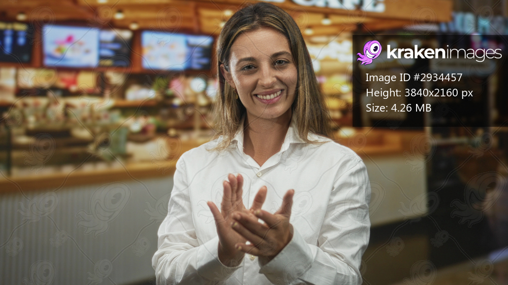 Woman clapping hands and smiling in a restaurant building wearing white shirt and gold earrings; warmth joy gratitude.